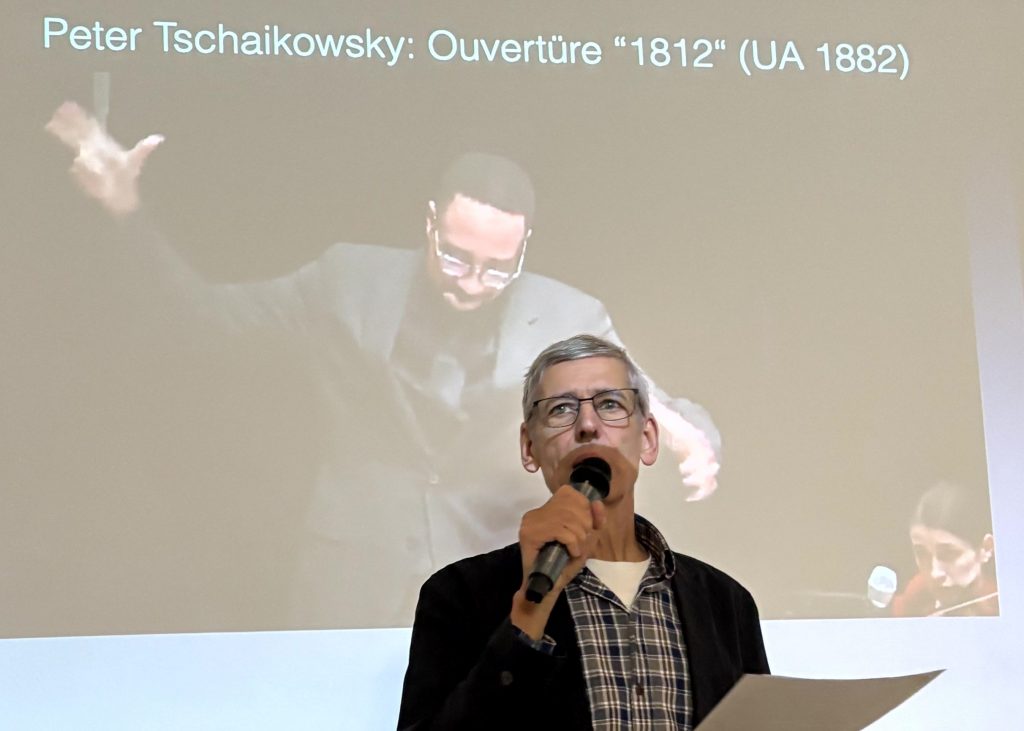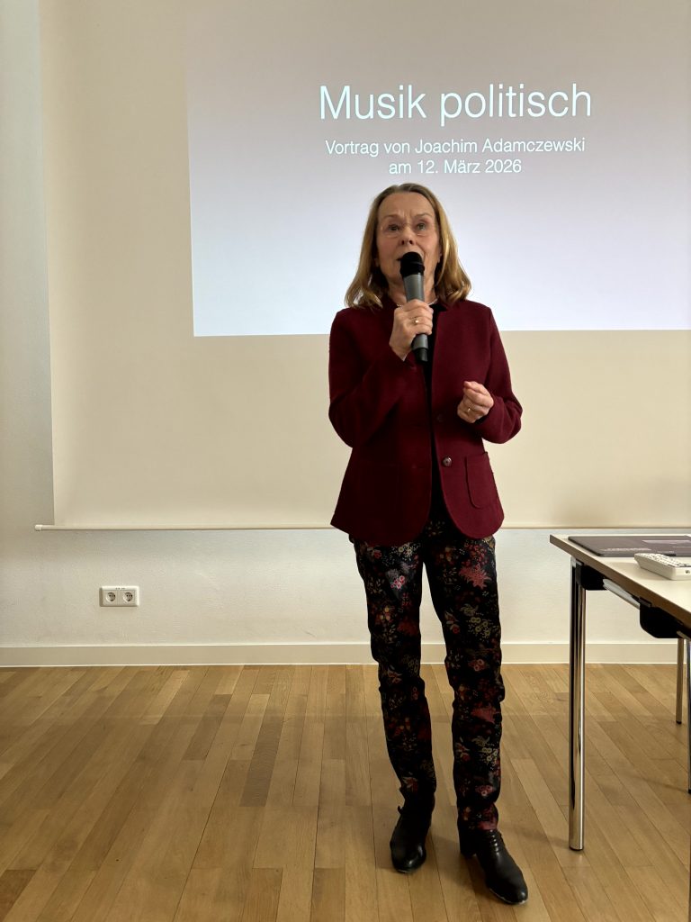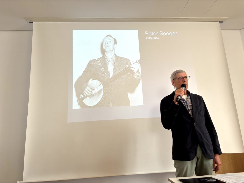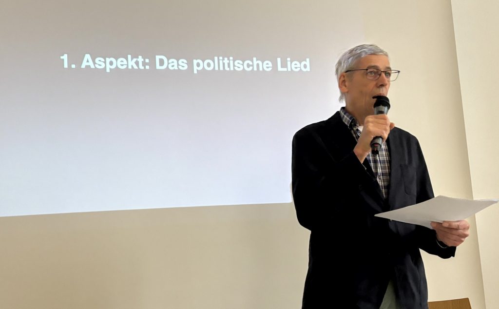 Denkt man im ersten Moment vielleicht nur an Marschmusik, Trommeln und Fanfaren, so lernt man im Vortrag, dass das „politische Lied“ bzw. politische Musik eine jahrhunderte alte, internationale Geschichte hat. Hörproben berühmter Komponisten von (u.a.) Oswald von Wolkenstein über Peter Tschaikowsky, Ludwig van Beethoven bis hin zu Peter Seeger waren eindrucksvolle Beispiele z.T. nur selten aufgeführter großer Werke. Großartig!
